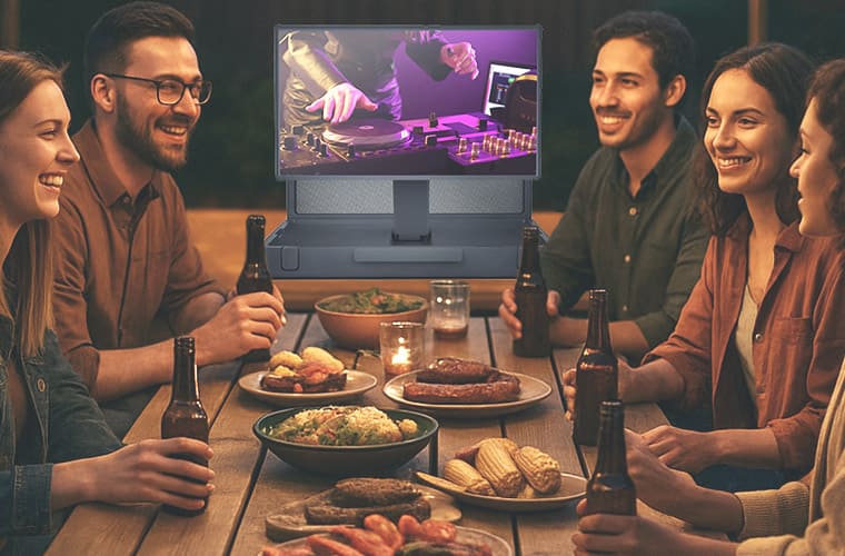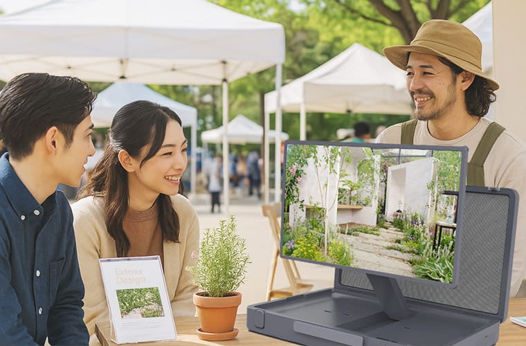 展示会やショールーム、マルシェなどの屋外イベント会場でのPR動画再生端末として。施工事例などを『見て選べる』相談ブースを作る際などに最適。