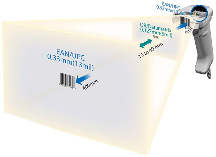 QRを含む複数の代表的なコードが 0mmから読み取り可能 です。狭いスペースや小さなラベルでも、距離調整なしで素早くスキャンできます。 - 遠距離側も余裕のある読み取り