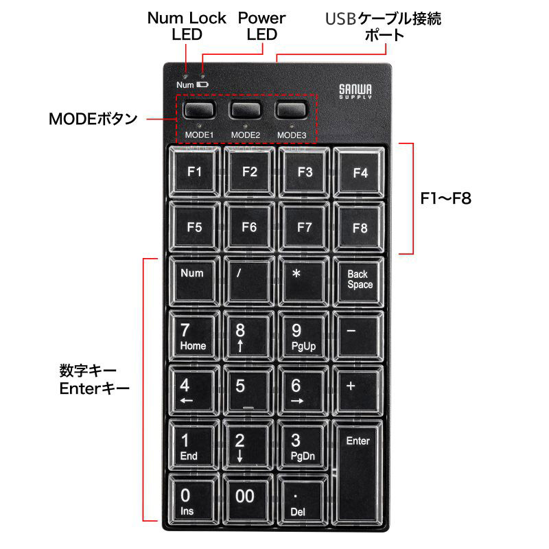 キーはしっかりした深めのメンブレンキー方式を採用、デスクトップキーボードと同じ19mmのフルピッチなので押しやすく、タイピングを快適に行うことができます。また、テンキーとして使用する場合はNumLock非連動の安心設計になっています。